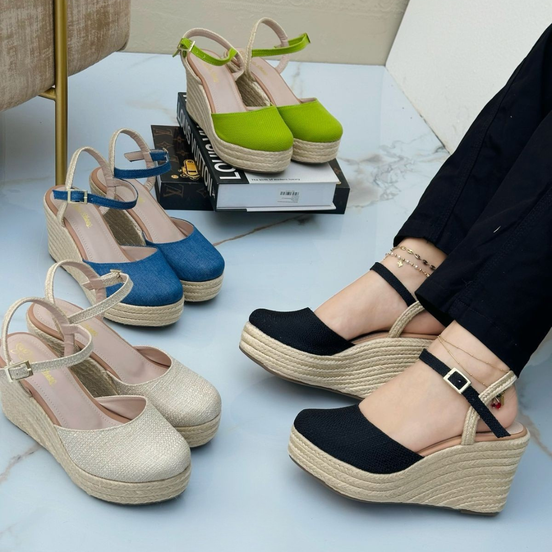 Descubre la fusión perfecta entre frescura, comodidad y estilo con nuestras alpargatas tipo cuña, diseñadas para mujeres que no quieren sacrificar altura por confort. Confeccionadas en lona texturizada tipo lino o mezclilla, estas plataformas están montadas sobre una elegante base de yute trenzado, evocando el encanto mediterráneo con un toque moderno.
