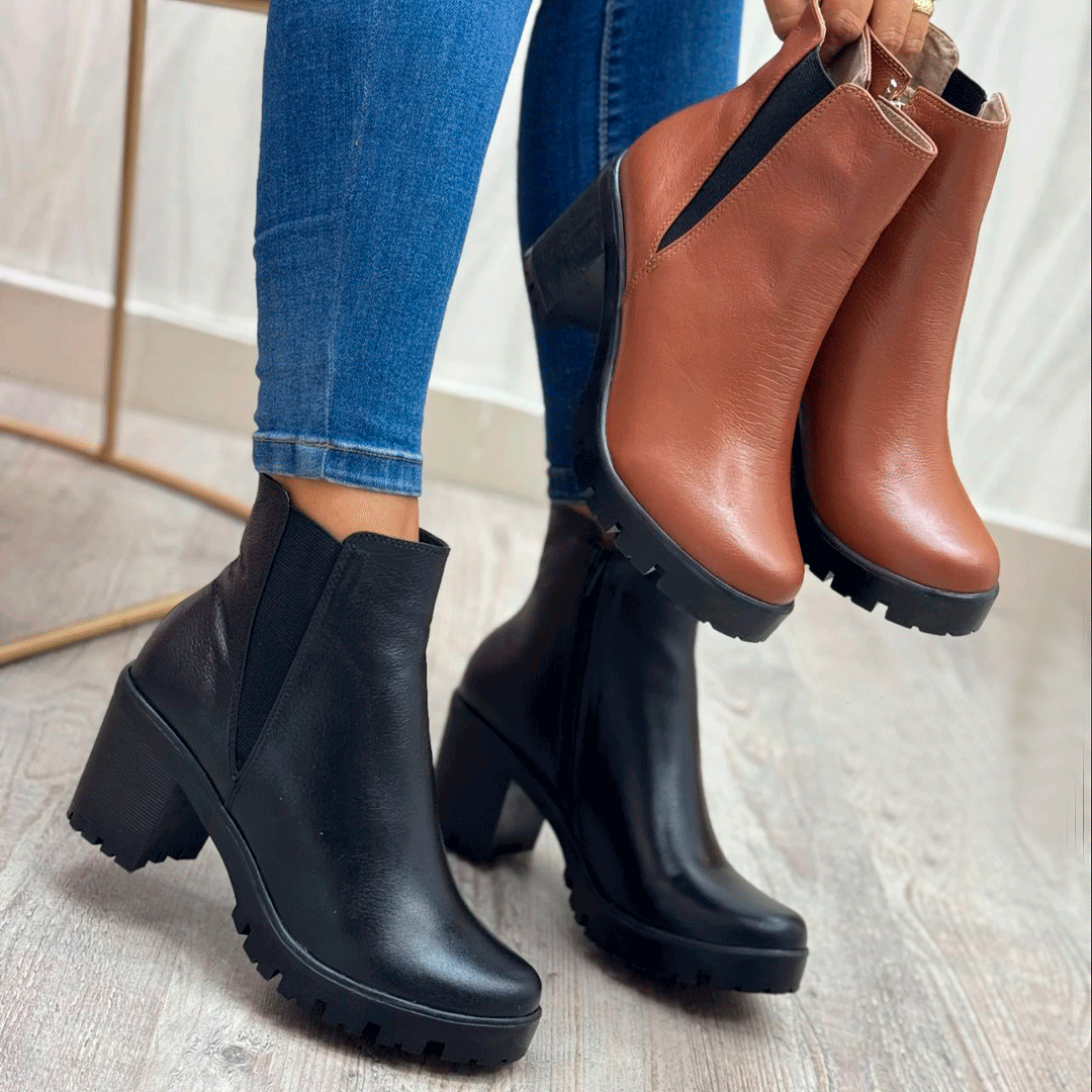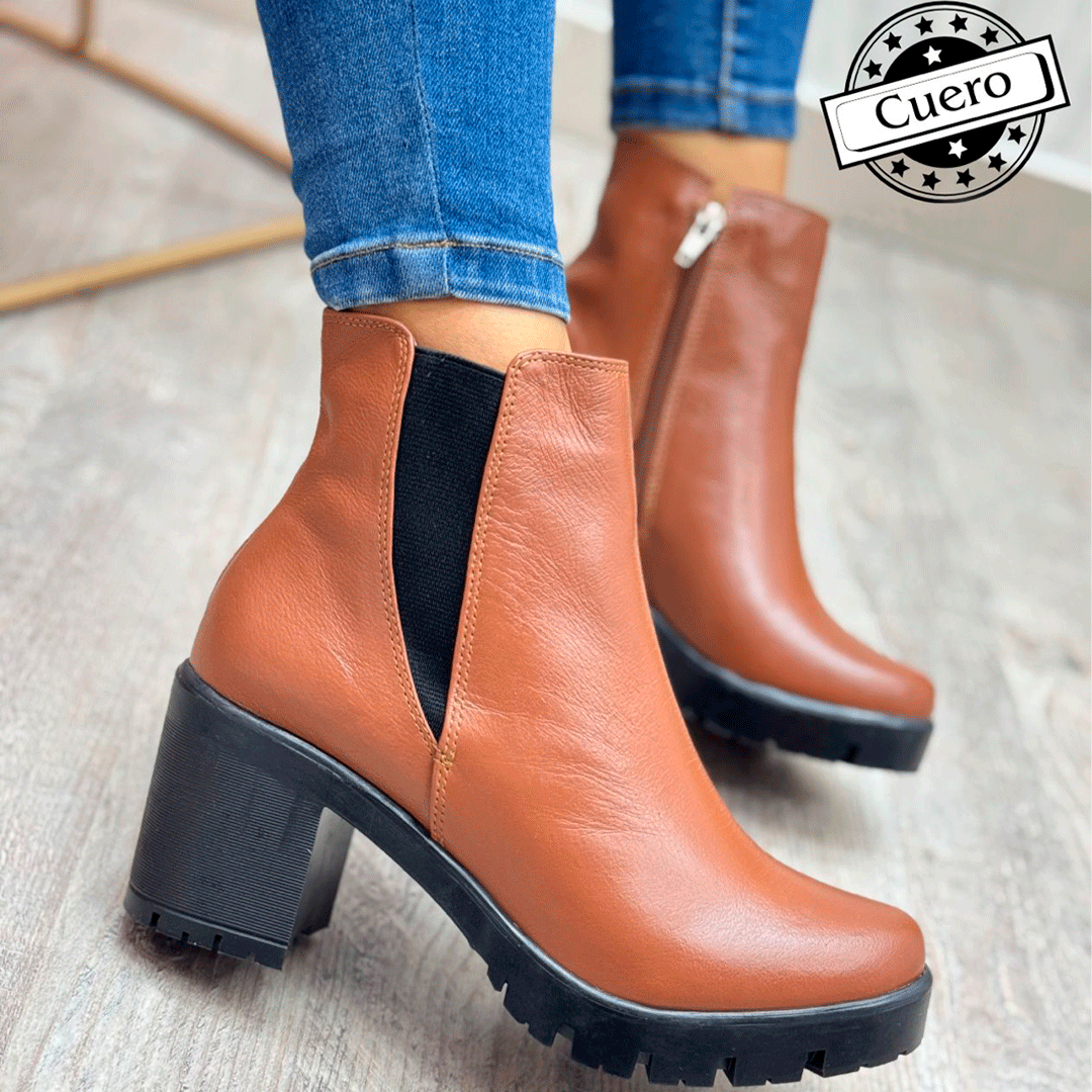 Botines de cuero 100% natural con suela antideslizante tipo tractorada, tacón medio estable y diseño ergonómico. Incluyen cierre lateral y elástico que facilita su calce y aporta comodidad en cada paso. Ideales para climas fríos, outfits ejecutivos o looks casual chic.